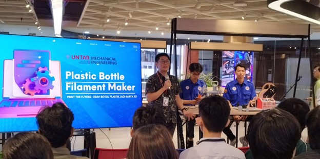 Keduanya menjelaskan prinsip kerja 3D printer, mulai dari mekanisme mesin hingga tahapan proses pencetakan. Mereka memperlihatkan bagaimana limbah plastik yang sering dianggap tidak bernilai dapat diubah menjadi bahan yang berguna untuk mencetak objek tiga dimensi dengan fungsi dan nilai estetika baru. Penjelasan ini menambah wawasan peserta, baik bagi mahasiswa/i Teknik Mesin Untar maupun mahasiswa/i DKV Untar, bahwa teknologi dapat menjadi alat penting dalam proses kreatif dan desain berkelanjutan.