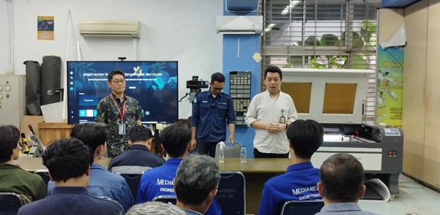 Acara dibuka dengan sambutan dari Dr. Ir. Steven Darmawan, S.T., M.T. selaku Ketua Program Studi Teknik Mesin Untar, yang menyampaikan pentingnya penguasaan teknologi manufaktur digital seperti laser cutting dalam mendukung kegiatan pembelajaran, penelitian, dan pengembangan inovasi di lingkungan kampus bagi dosen, tenaga kependidikan (tendik), serta mahasiswa Teknik Mesin Untar. Selain itu, beliau juga mendorong mahasiswa untuk aktif mengeksplorasi penerapan teknologi sebagai bekal menghadapi tantangan industri di masa depan.