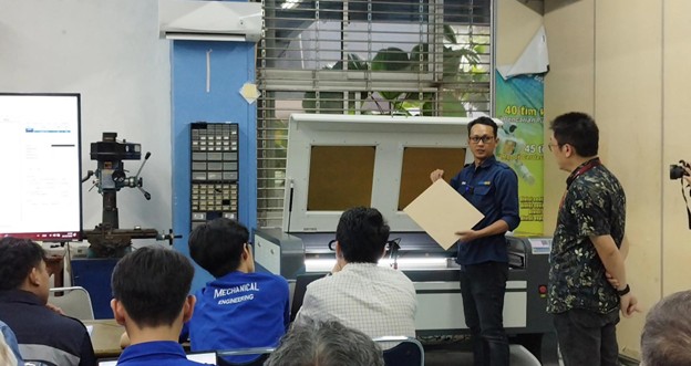 Setelahnya, peserta diajak menyaksikan demonstrasi langsung pengoperasian mesin laser cutting. Dalam sesi praktik tersebut, peserta memperoleh wawasan mengenai tahapan pengaturan parameter pemotongan, kalibrasi daya laser, serta konversi desain digital menjadi bentuk fisik melalui sistem pemotongan otomatis dan pemilihan material yang tepat.