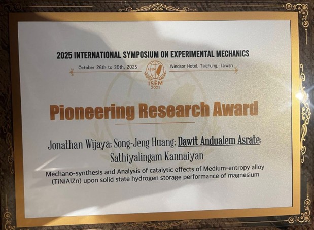 Di Taiwan, Jonathan memperoleh kesempatan belajar hampir setara penelitian tingkat S2 hingga S3, bekerja mandiri, dan berkolaborasi dengan para peneliti internasional untuk menganalisis hasil eksperimen serta berkontribusi pada pengembangan teknologi energi berkelanjutan. Dedikasinya membuahkan pencapaian bergengsi: Pioneering Research Award di 2025 International Symposium on Experimental Mechanics yang diselenggarakan pada tanggal 26-30 Oktober 2025 di Taichung, Taiwan.