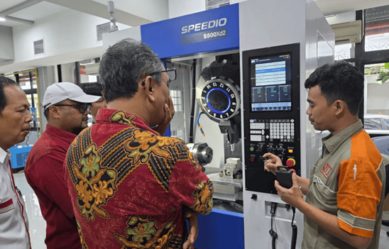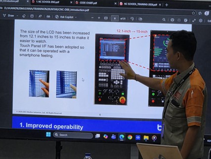 Workshop ini menghadirkan pemaparan mengenai perkembangan teknologi mesin CNC generasi terbaru serta penerapannya dalam sistem manufaktur berbasis digital. Materi yang disampaikan mencakup transformasi sistem kontrol mesin CNC, penerapan standar keselamatan kerja, efisiensi energi, serta integrasi otomasi industri. Kegiatan ini dipandu langsung oleh Bapak Jajang Maulana selaku perwakilan dari PT. Omega Taiyo Teknologi sebagai mitra industri dalam kegiatan ini. Selama rangkaian workshop, peserta memperoleh gambaran mengenai perubahan mesin CNC modern yang kini mengandalkan layar sentuh (touchscreen) berukuran besar dengan konsep smart interface, sehingga pengendalian mesin menjadi lebih efektif dan efisien.