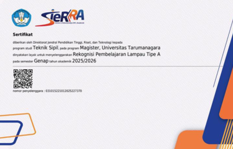 Program Studi (Prodi) Magister Teknik Sipil (MTS) telah menerima jalur pendaftaran Rekognisi Pembelajaran Lampau (RPL) tipe A untuk semester genap tahun akademik 2025/2026. Sertifikat SIERRA (Sistem e-Rekomendasi RPL Akademik) telah diberikan oleh Direktorat Jenderal Pendidikan Tinggi, Riset, dan Teknologi kepada program Magister Teknik Sipil Universitas Tarumanagara.